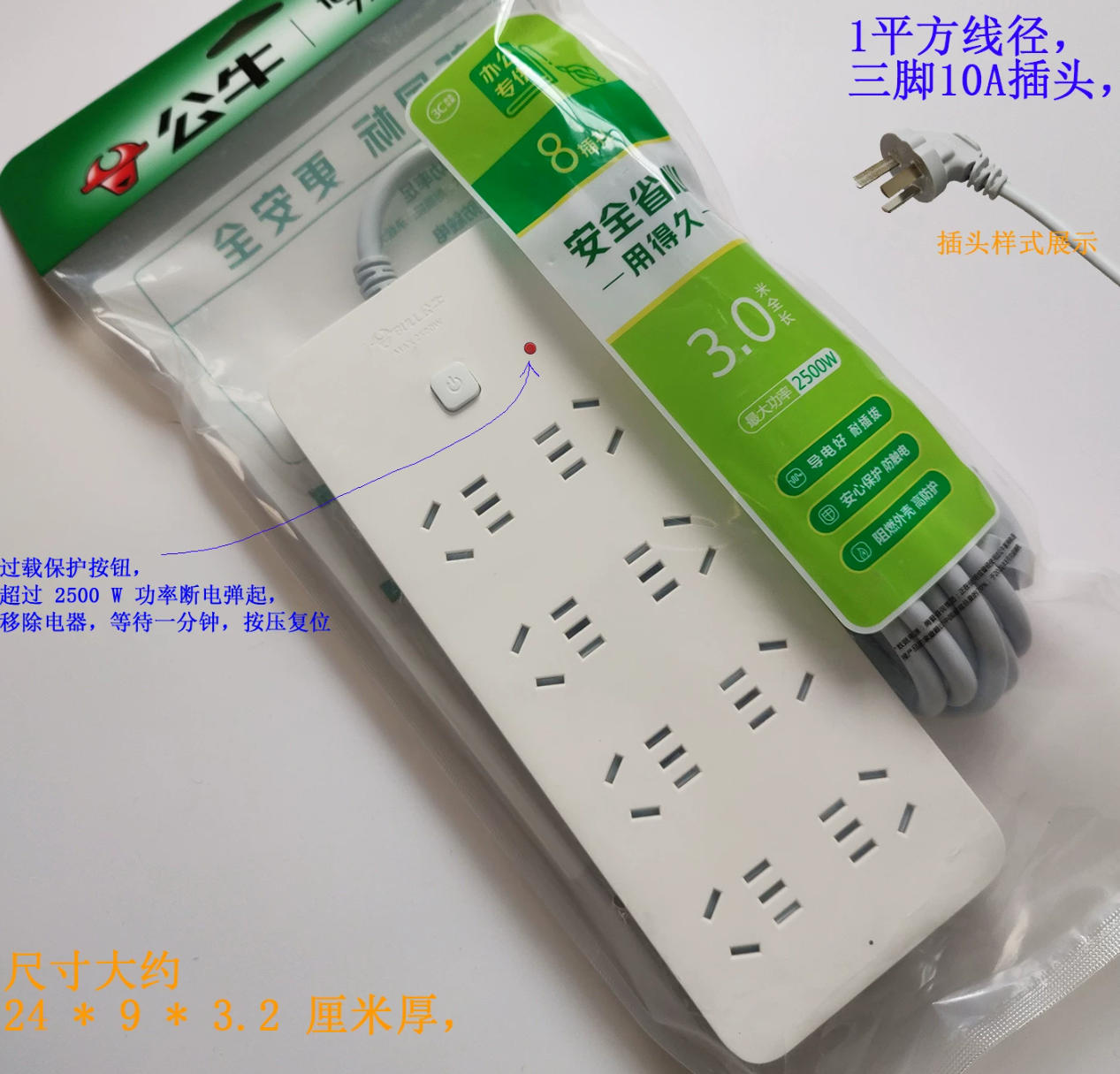 公牛8插位全长3米-M1080-3 插座